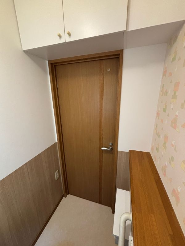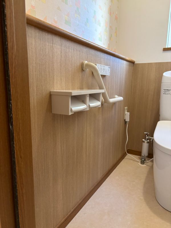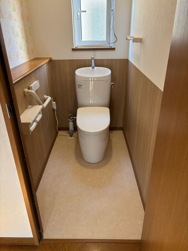 古くなったトイレを節水型に取り替えしました。 給水管の位置を下へ移動し、配管がレバーの横で目に入っていたのですが、目に付かないようになり、こちらもすっきりした空間になりました。 お客様と、弊社担当者とで打合せをさせていただき、「今はまだ必要としていないが手すりを将来取り付けできるように」とお話しをいただき、今回の改修工事で壁を開き下地をいれ、今後すぐ対応できる準備をさせていただきました。 内装のクロスやクッションフロアを変更すると、イメージがガラッと変わります。 事前に打ち合わせをしご希望に近づくように、担当者がお客様と一緒に考え、アドバイスさせていただいております。 朝から工事をはじめ、夕方にはすべての作業を完了し、無事お客様にお引渡しする事ができました。